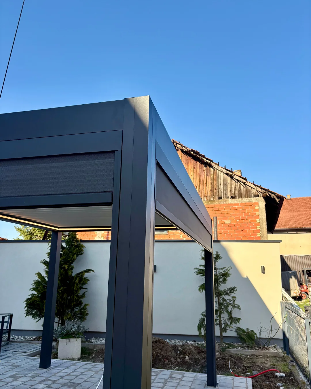 Eco Climatic pergolas are a modern bioclimatic solution for covering terraces, courtyards and catering areas, designed for maximum comfort and functionality. Thanks to movable aluminum slats, they allow precise regulation of light and ventilation, with reliable protection from the sun and rain. Stable construction and quality materials ensure durability, resistance to external influences and aesthetic elegance that increases the value of the building.